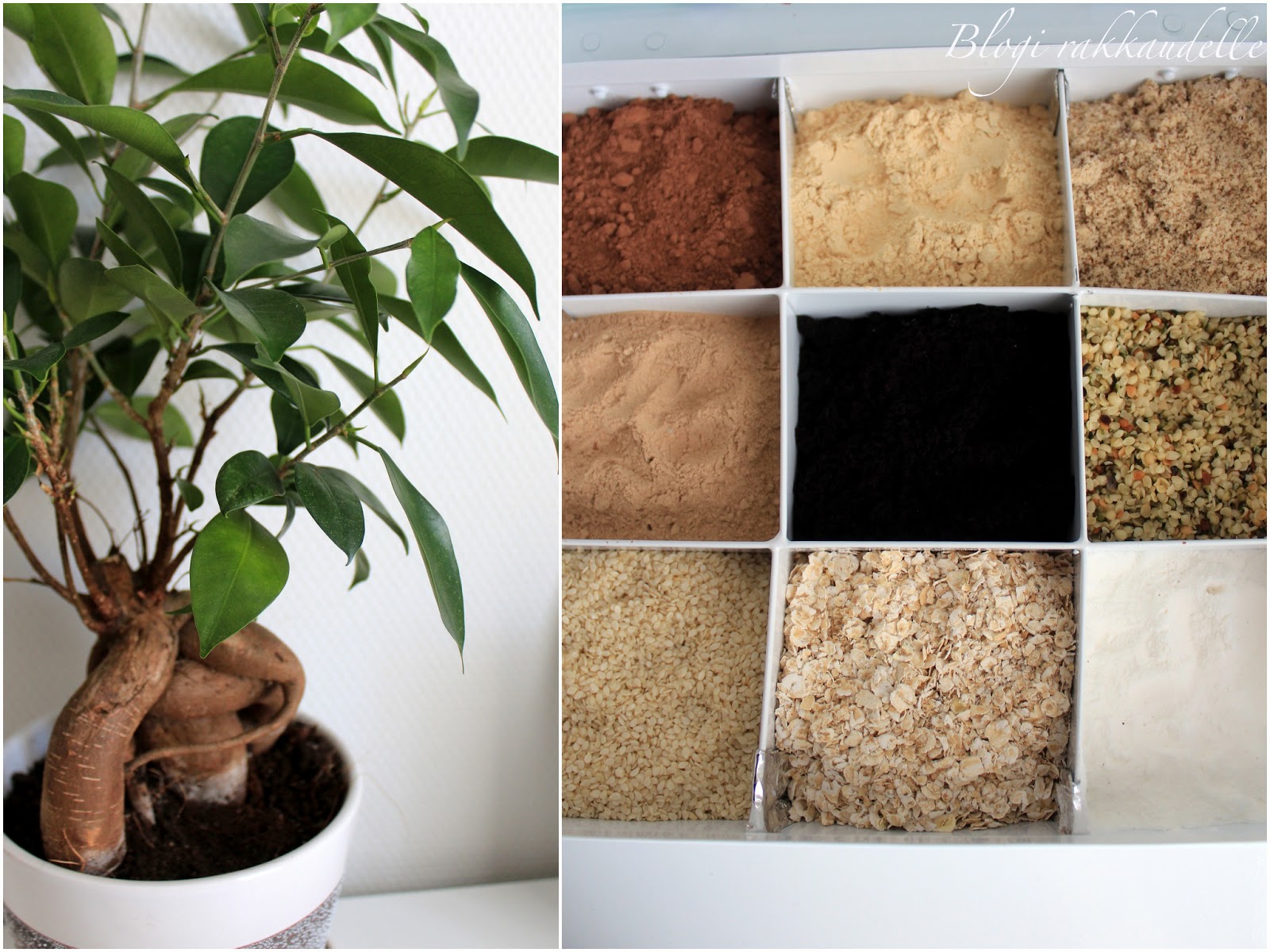 Kotona vuorasin laatikkoa hieman foliolla, jotta se pysyisi siistinä eikä ainekset sekoittuisi. (siellä oli aika rakoja..) Sitten lisäilin jokaiseen lokeroon smoothie aineksia: manteli-, maca-, acaimarja-, lucuma-, kaakao- ja steviajauheita sekä seesamin- ja hampunsiemeniä. Ja vielä lopuksi kaurahiutaleita. Namsk!! :)
